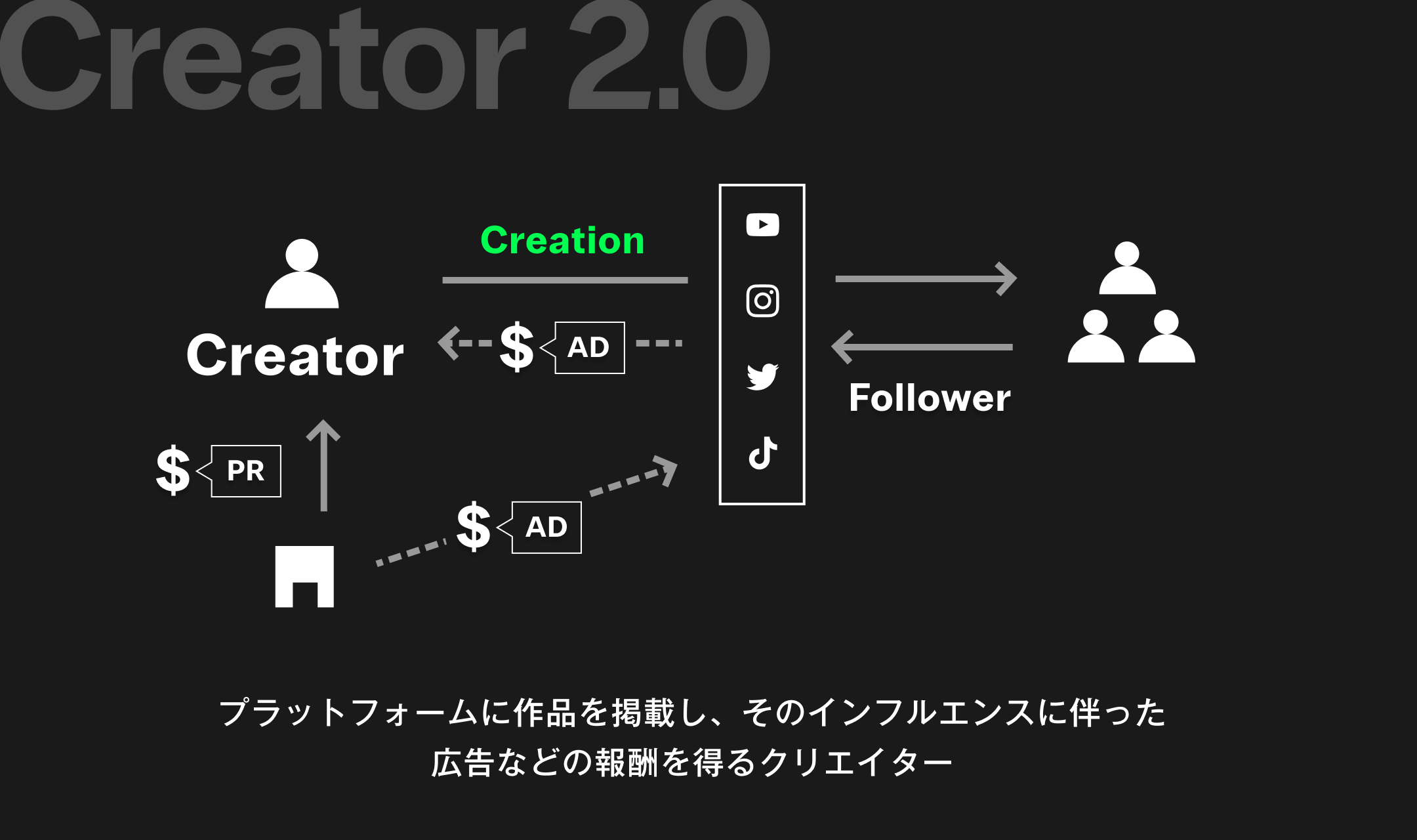 一方で、「クリエイティビティ」よりも「インフルエンス」が重要視され、「フォロワー数が多いインフルエンサーこそがクリエイターとして優秀」という認識が生まれつつあります、また「広告主である企業からクリエイターが仕事をいただく」という上下関係が定着し、本来の作品が適切に評価されづらく、多くのクリエイターが言わば搾取されてしまっている状況に、歯痒さと悔しさを感じたクリエイターも少なくないでしょう。